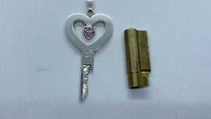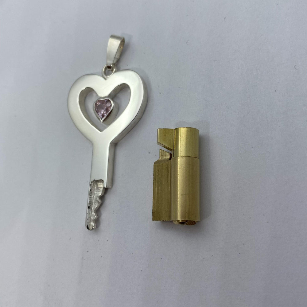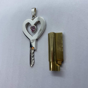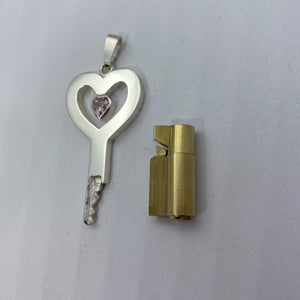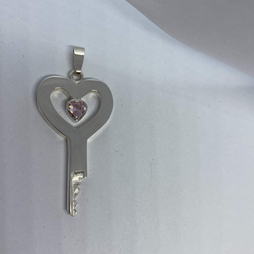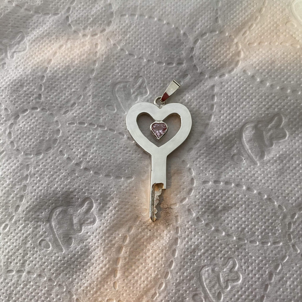 It's a sterling silver key with a heart shaped stone in the middle of the heart.