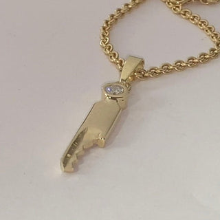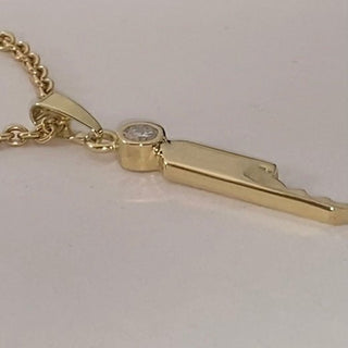14 carat solid yellow gold key with a 0.20 carat brilliant cut stone. This key is available with a zirconia stone of brilliant cut diamond in different sizes, quality Top Wesselton VVSi.