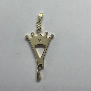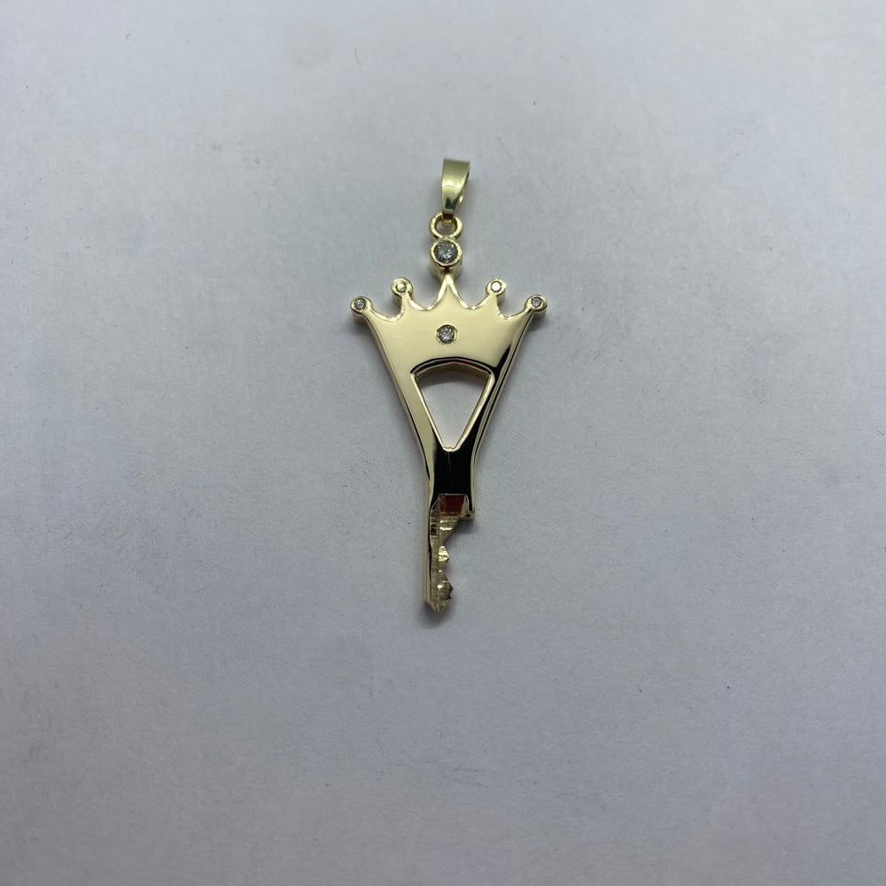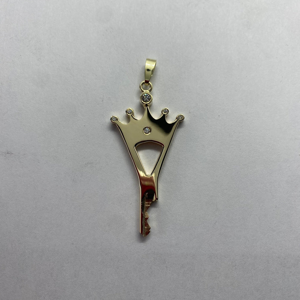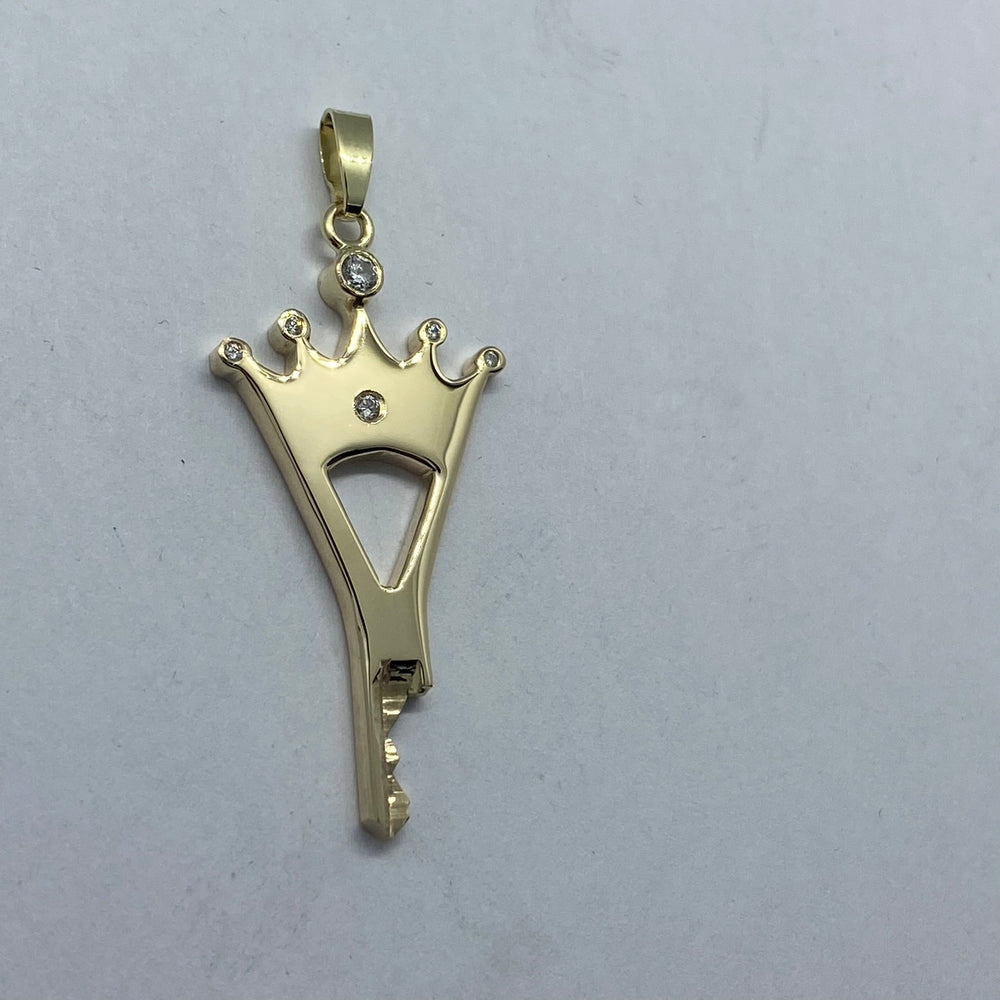 Set with in top of the crown one 0.10 carat brilliant cut diamond and four 0.01 carat brilliant cut diamonds. In the middle of the key is placed one 0.03 carat brilliant cut diamond. Quality of all diamonds: Top Wesselton VVSi.