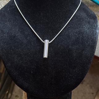 Handmade in sterling silver and we recommend a silver snake necklace because this will fit perfectly through the hole in the pendant.
